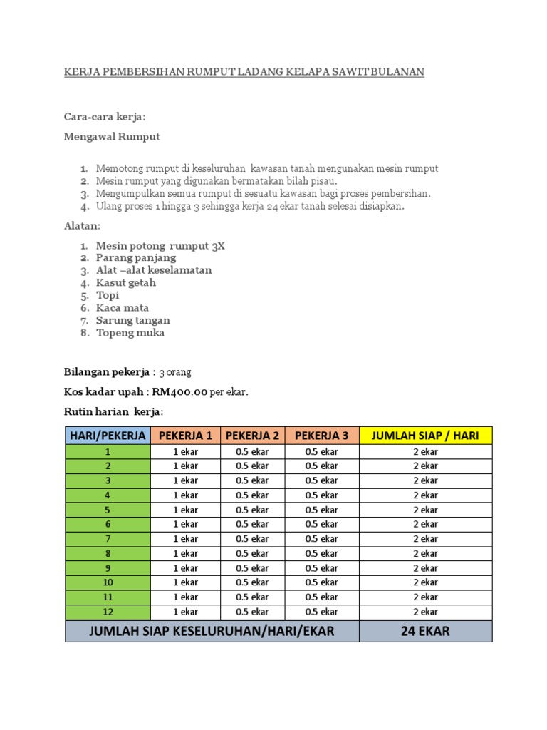Kerja Pembersihan Rumput Ladang Kelapa Sawit Bulanan Pdf